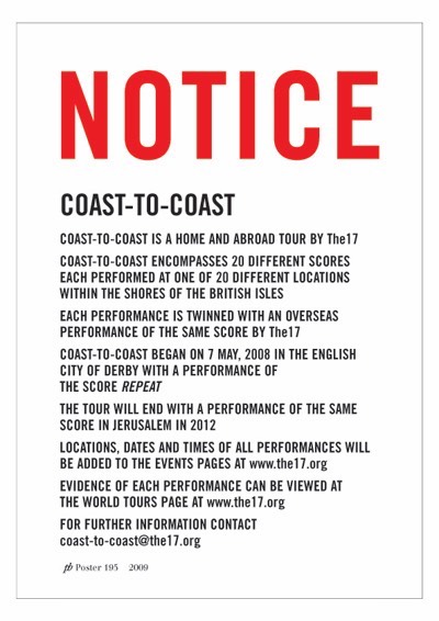 SLICE THROUGH DERBY is the name given to the performance of Score 317 REPEAT performed in the English city of Derby. This work has been commisioned to celebrate the opening of QUAD, the multi-million pound arts centre to be opened in August in Derby. Documentation of this performance was exhibited in QUAD between August 2008 and January 2009. All 100 performances within SLICE THROUGH DERBY are listed on these events pages. This performance is part of the Coast-to-Coast world tour by The17 and is twinned with a performance of the same score in Jerusalem in 2012. |